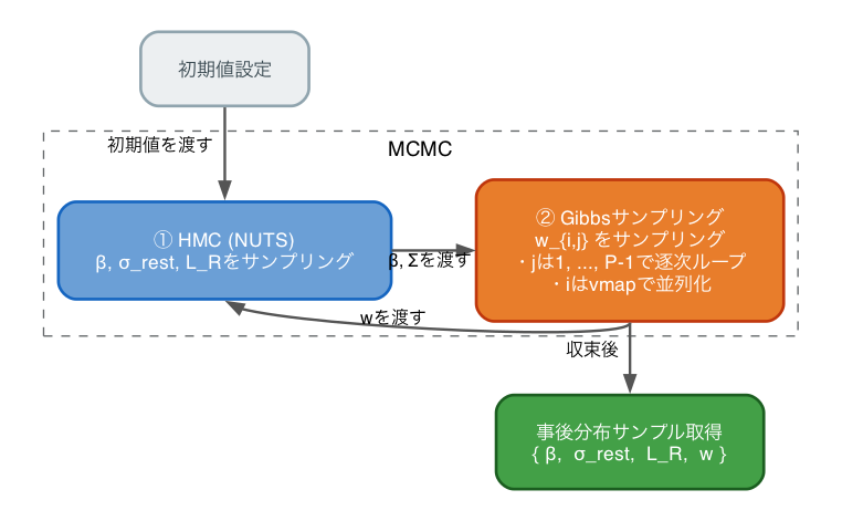 MCMCを実行する前に、初期値の設定に少し工夫が必要です。というのも、HMCGibbsにおけるNUTSは非制約空間で動作する関係上、init_paramsには各パラメータを非制約値へ変換した値を渡す必要があります。